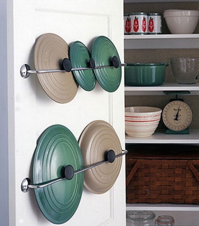 12. Крышки от кастрюль не займут много места, если аккуратно разместить их на дверце шкафа,